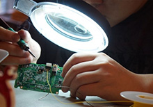 Сотрудник сервис центра осуществляет ремонт: заменяет сломанную запчасть рабочей оригинальной частью